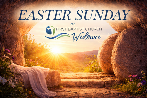 Celebrate this good news with us this Easter! If this will be your first time at First Baptist Church Wedowee, we invite you to stop by the Rally Room, to the left as you enter the Family Life Center. We would love to meet and connect with you!